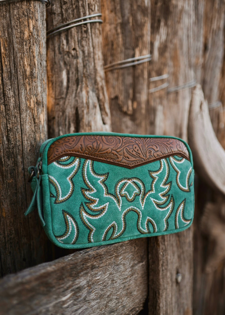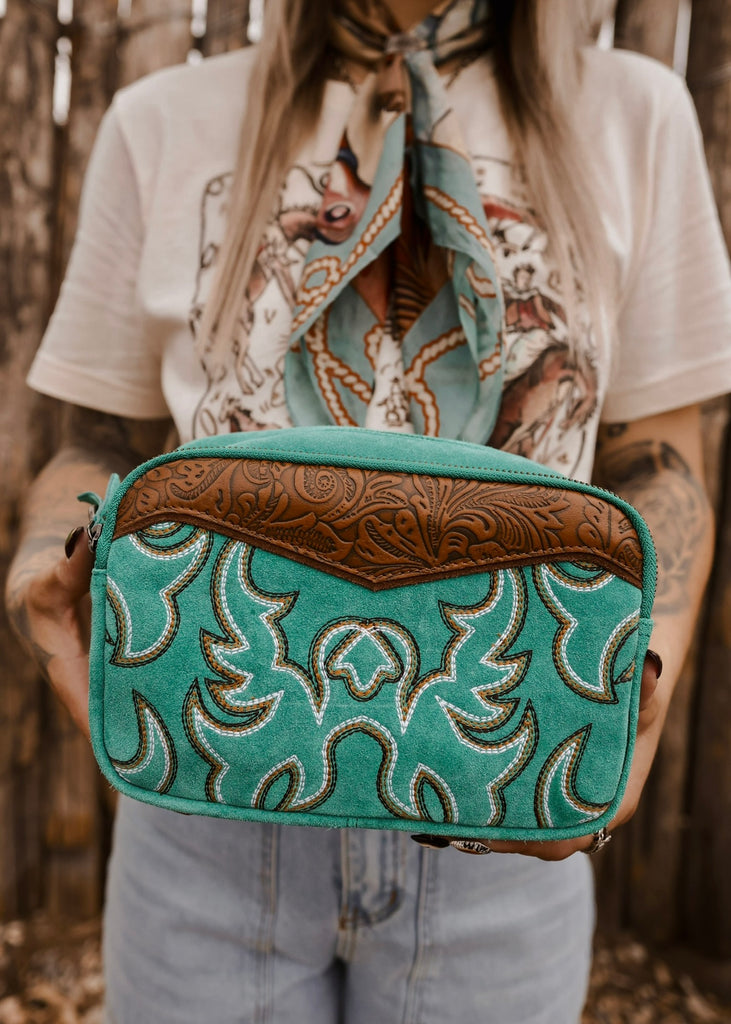 Carry a piece of Texas charm wherever you roam with the Amarillo Nights Clutch. Crafted from rich turquoise suede material and accented with embossed leather and boot-stitch embroidery, this Western-inspired piece blends rugged style with everyday function. Compact yet bold, it’s perfect for rodeo nights, festival days, or slipping into your tote when you’re on the go.