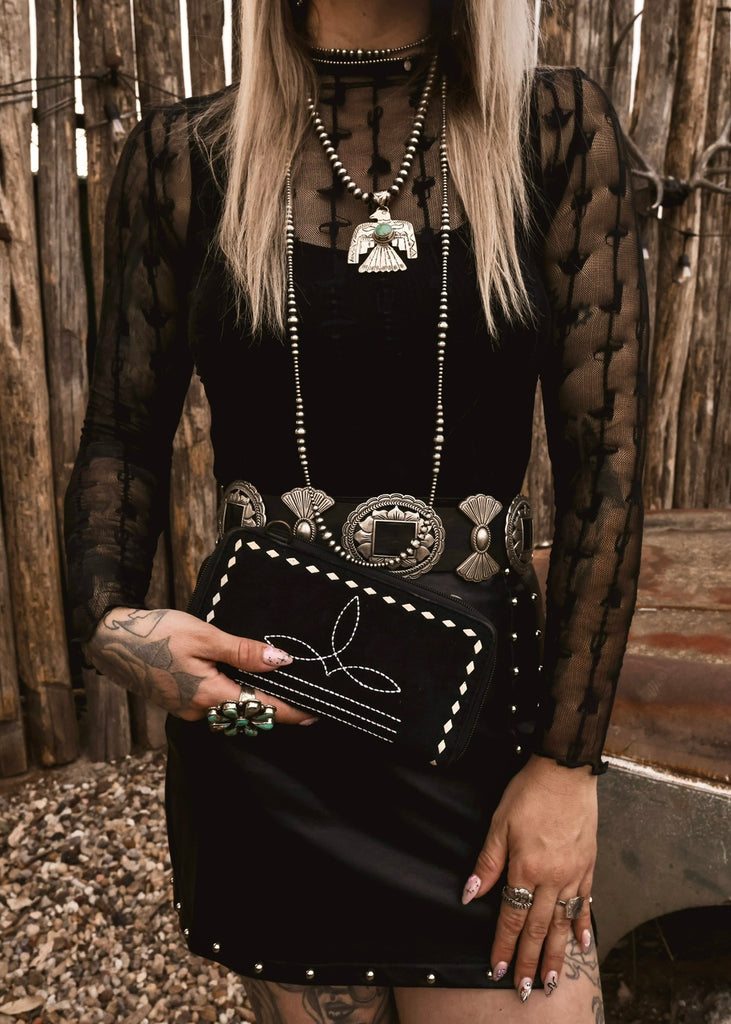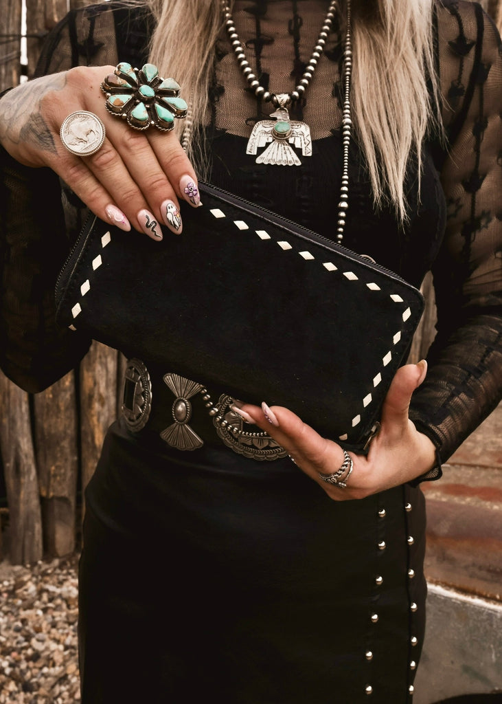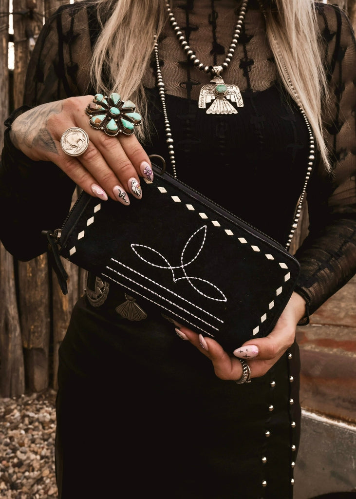 Saddle up in style with The Boot Stitch Suede Wallet, a versatile piece that blends classic Western stitching with everyday function. Crafted from black suede and accented with traditional boot-stitch embroidery, it’s a nod to the artistry of cowboy boot making.