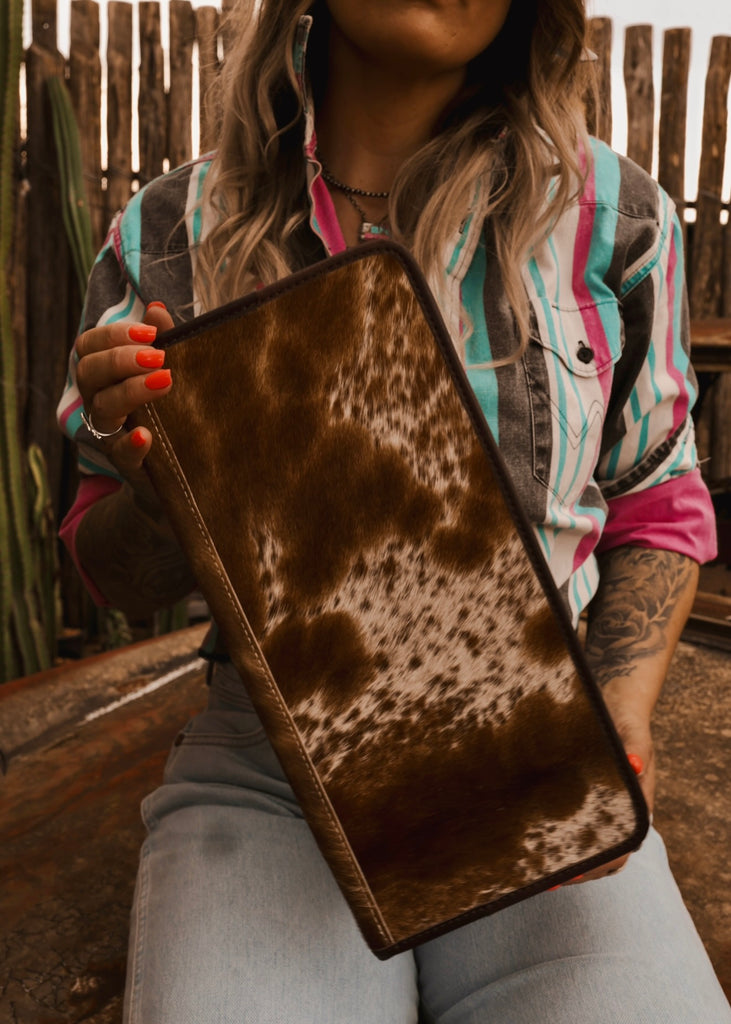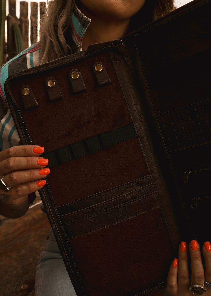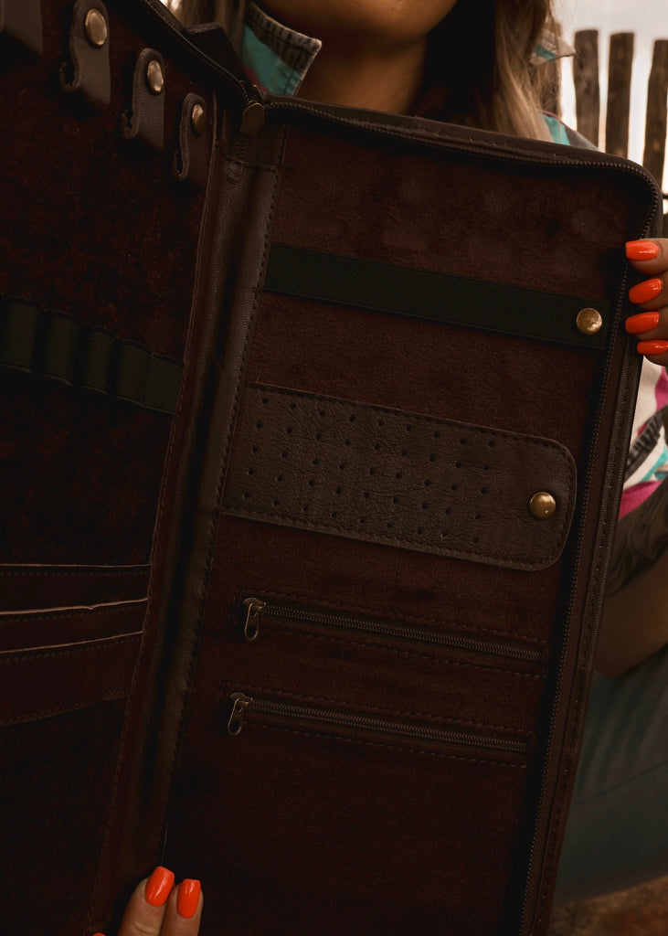 Crafted for the road-roamin’ cowgal, the Cattle Drive Jewellery Wallet blends authentic character with true practicality. Featuring genuine cowhide panels framed by tooled leather corners, it opens to a soft velvet-lined interior complete with necklace tabs, dual zippered compartments, and secure storage for earrings, rings, and bracelets. Designed to keep your treasures tangle-free and travel-ready, this full-zip wallet brings timeless western style to every journey.