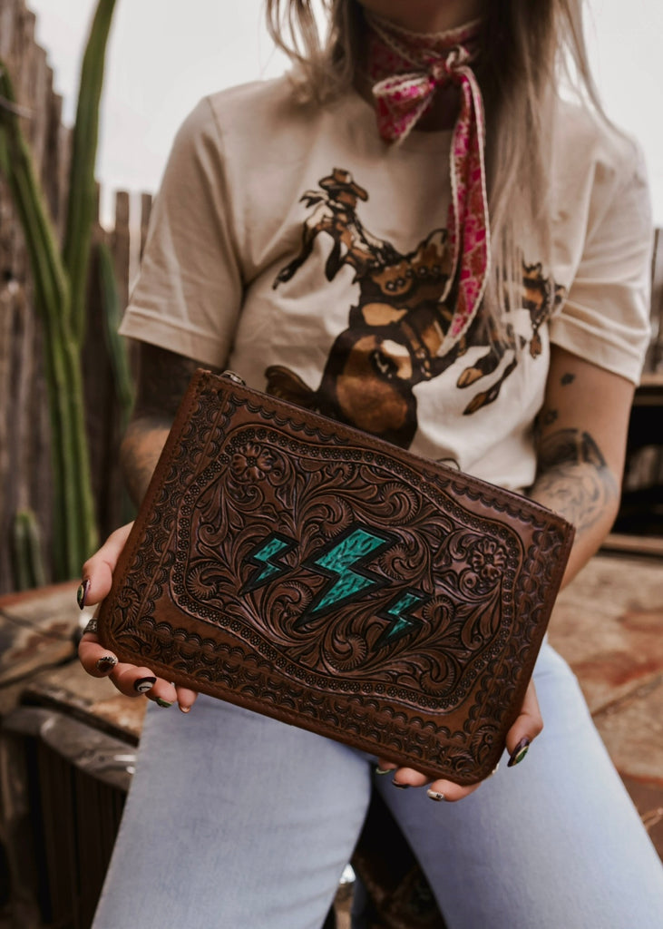 Crafted from rich brown leather and featuring intricate floral carving that frames the centerpiece of striking turquoise lightning bolts, capturing the spirit of a desert storm.