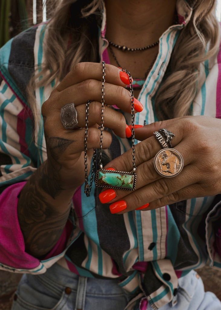 The bar necklace our cowgirls can’t get enough of. The Classic Bar Necklace features genuine Kingman Turquoise - celebrated for its vibrant blue tones and timeless desert charm. Mined in Arizona’s historic Kingman region, each stone tells its own story of Southwestern spirit and sky. A Western staple reimagined - rich Kingman Turquoise framed in sterling silver rope detailing. Effortless on its own, iconic in a stack.