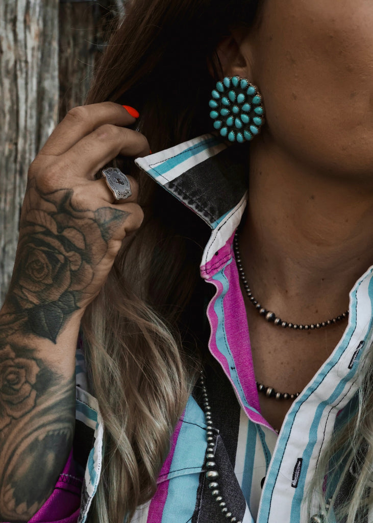 Bold and unmistakably Western, hard to ignore. These multi-stone statement studs showcase hand-selected genuine Kingman turquoise set in intricate sterling silver, radiating with the vibrant hues of the Arizona desert. Each stone is hand-set to create a classic blooming design.
