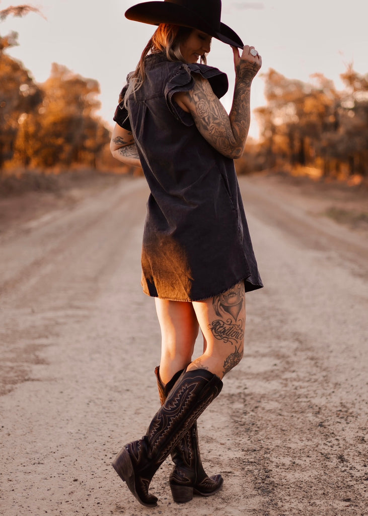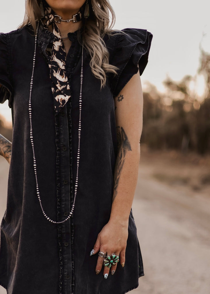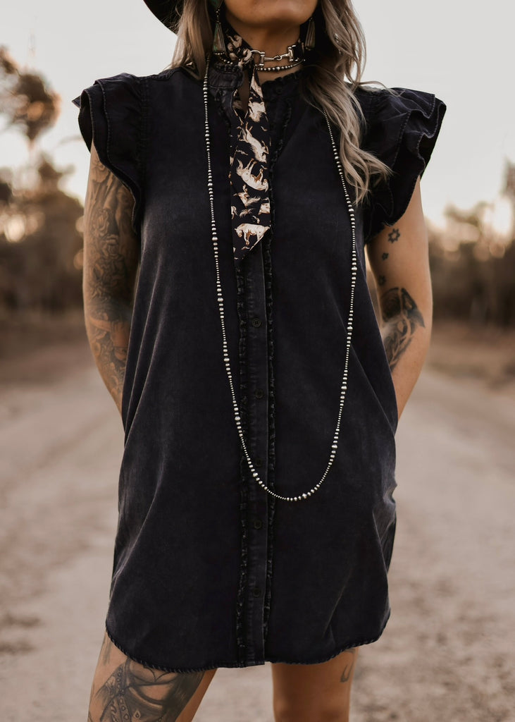 The Midnight Mesa Dress is western chic with a touch of edge. Crafted in a washed black denim look, this sleeveless shirt dress features pockets and subtle ruffle details on the shoulders for a feminine twist. Easy to style with boots, hats, or layered jewelry, it’s the perfect piece for day-to-night wear, at the rodeo, or out under the desert stars. A timeless staple for the modern western wardrobe.