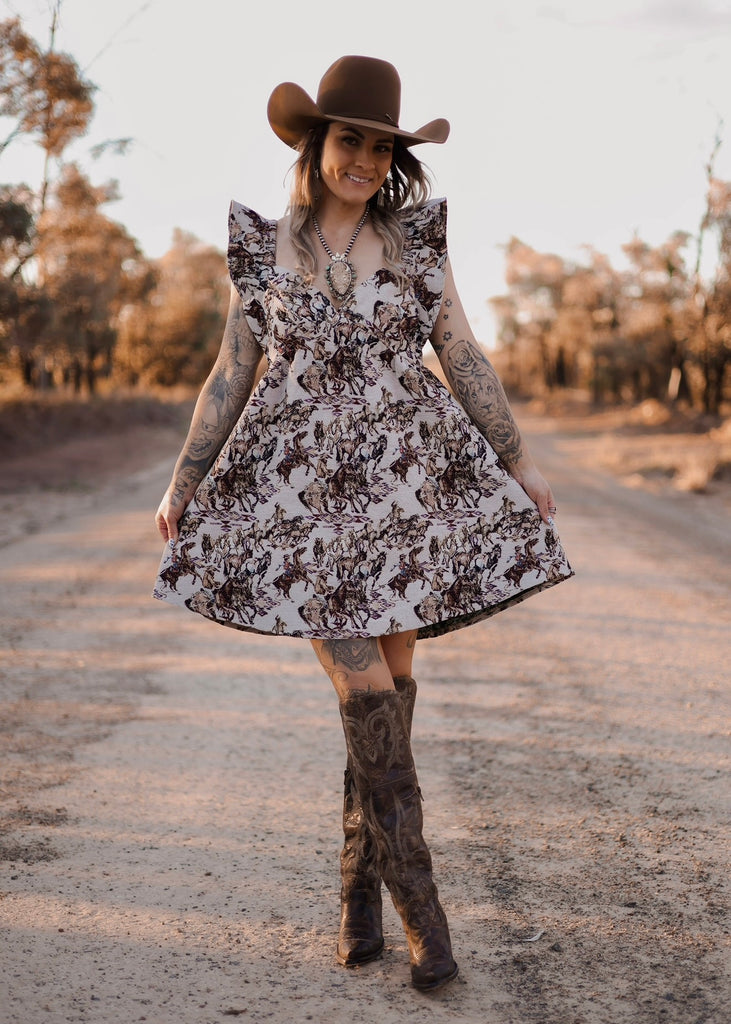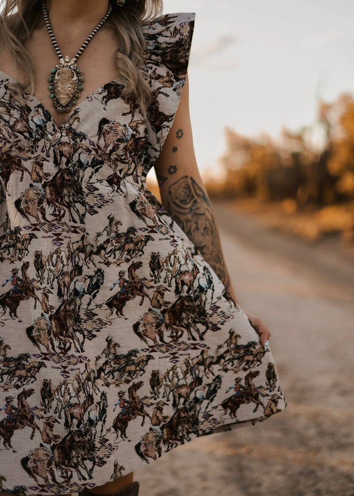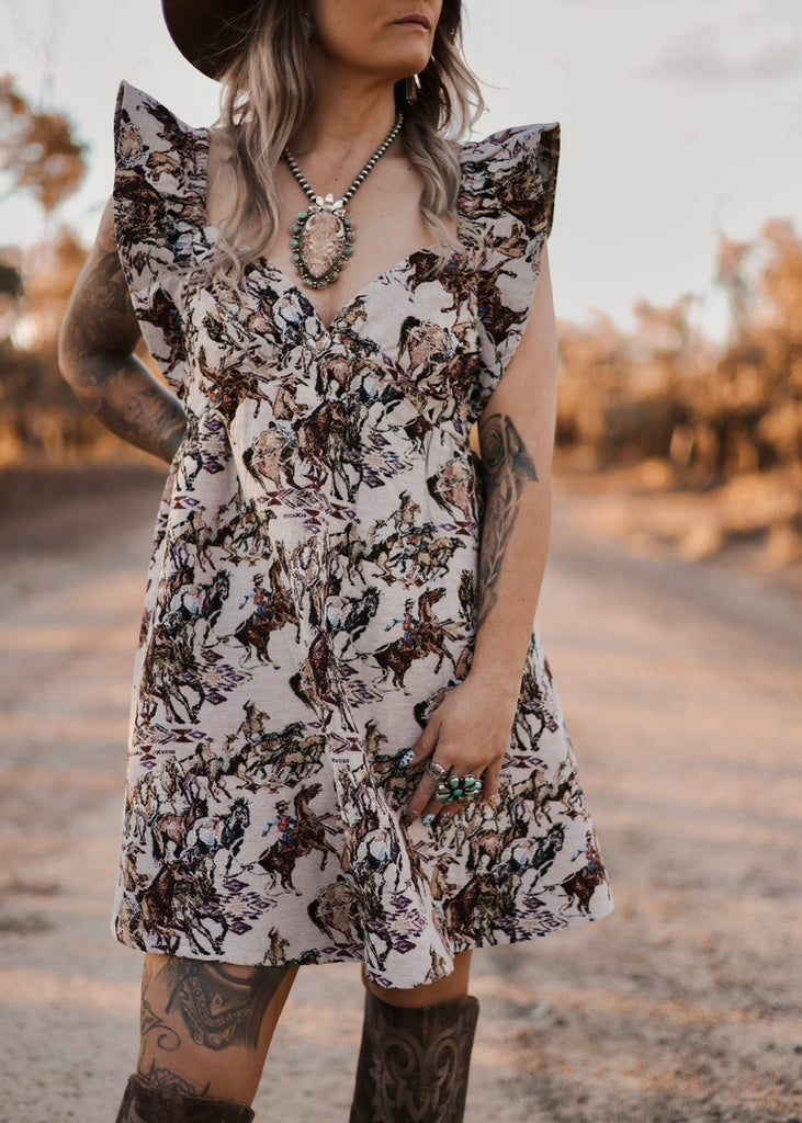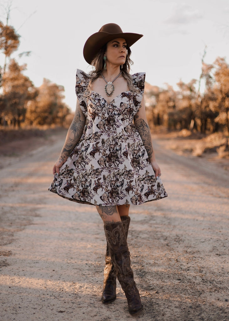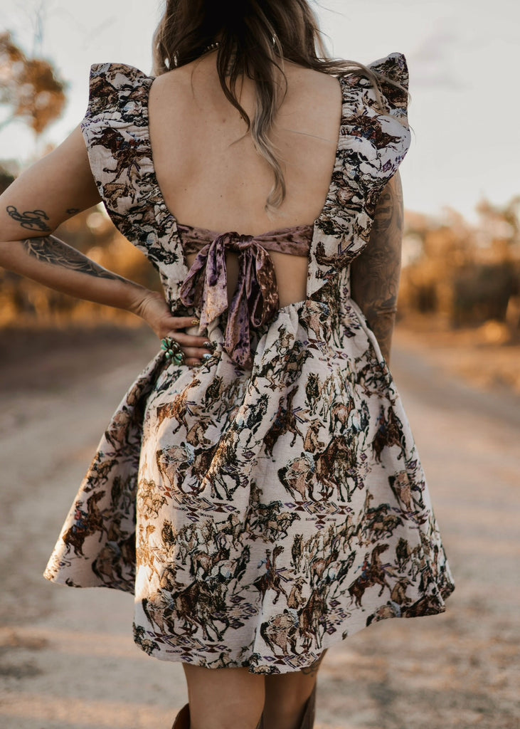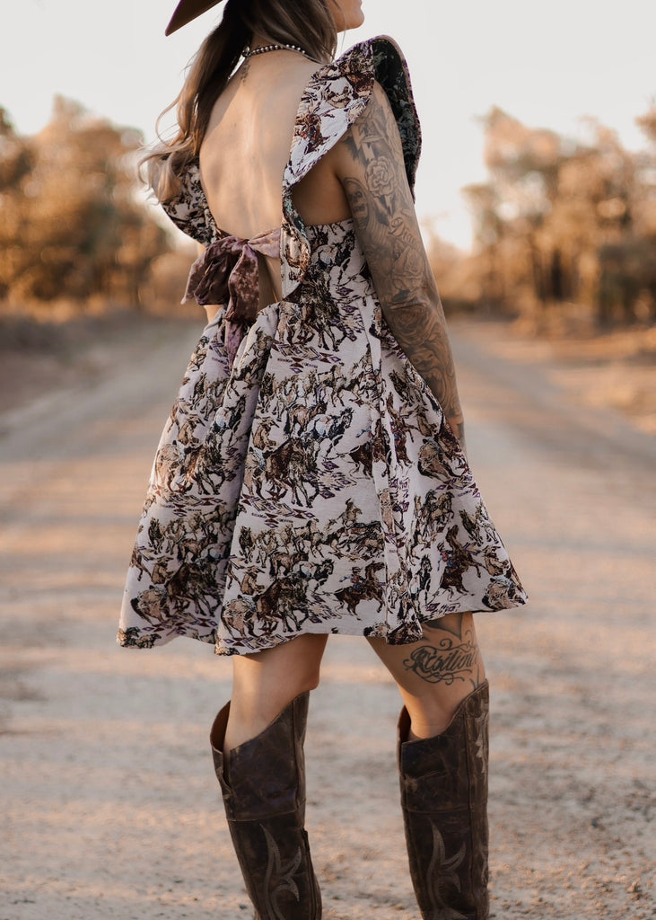 Gorgeous western tapestry fabric featuring an all-over cowboy print, bold ruffle sleeves and a twirl-worthy skirt that brings structured movement to every step finished with a velvet tie at the back.