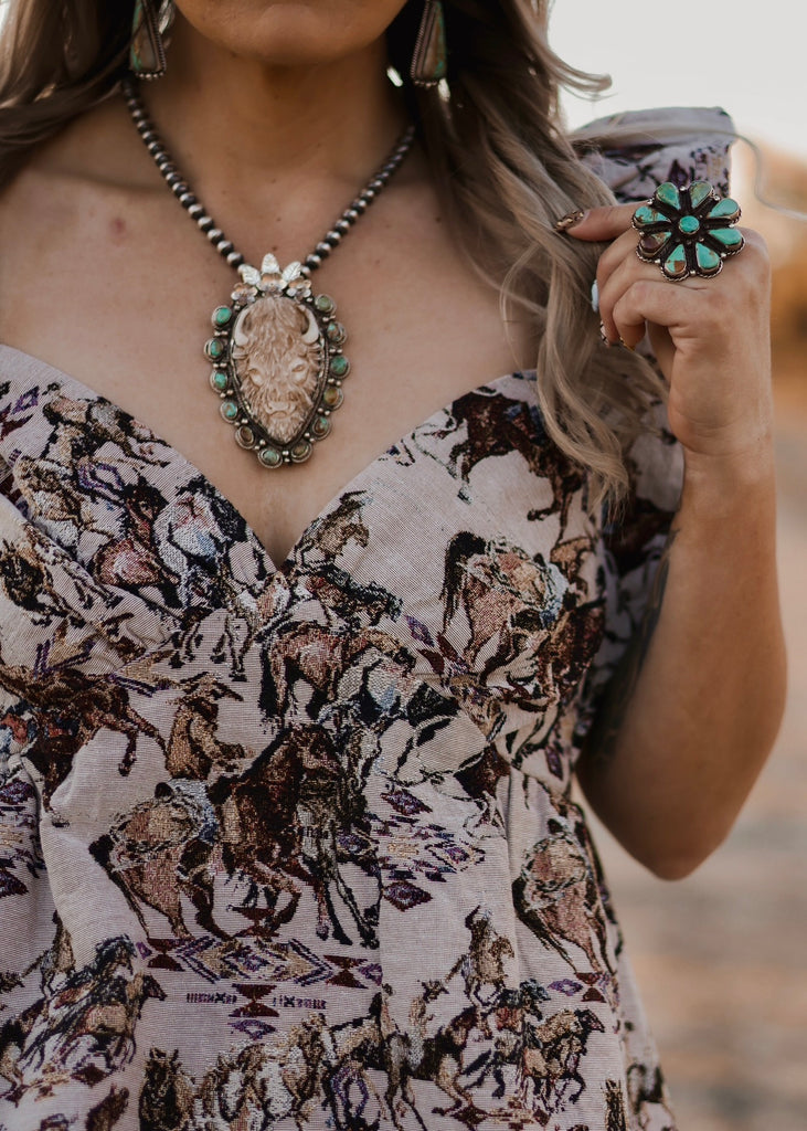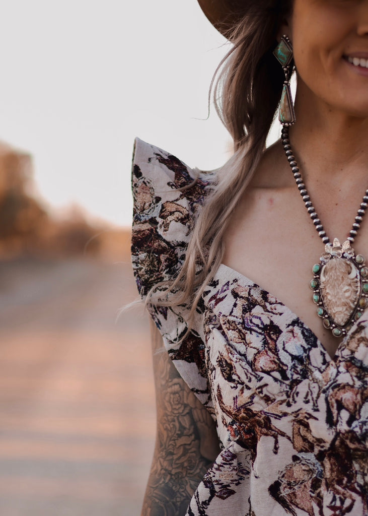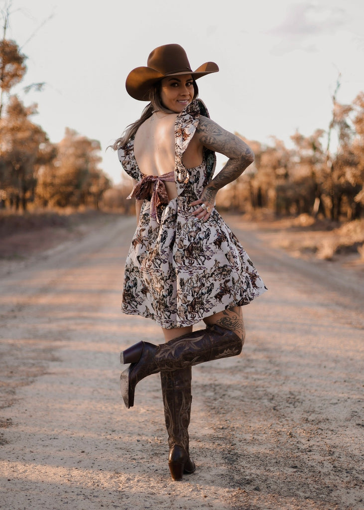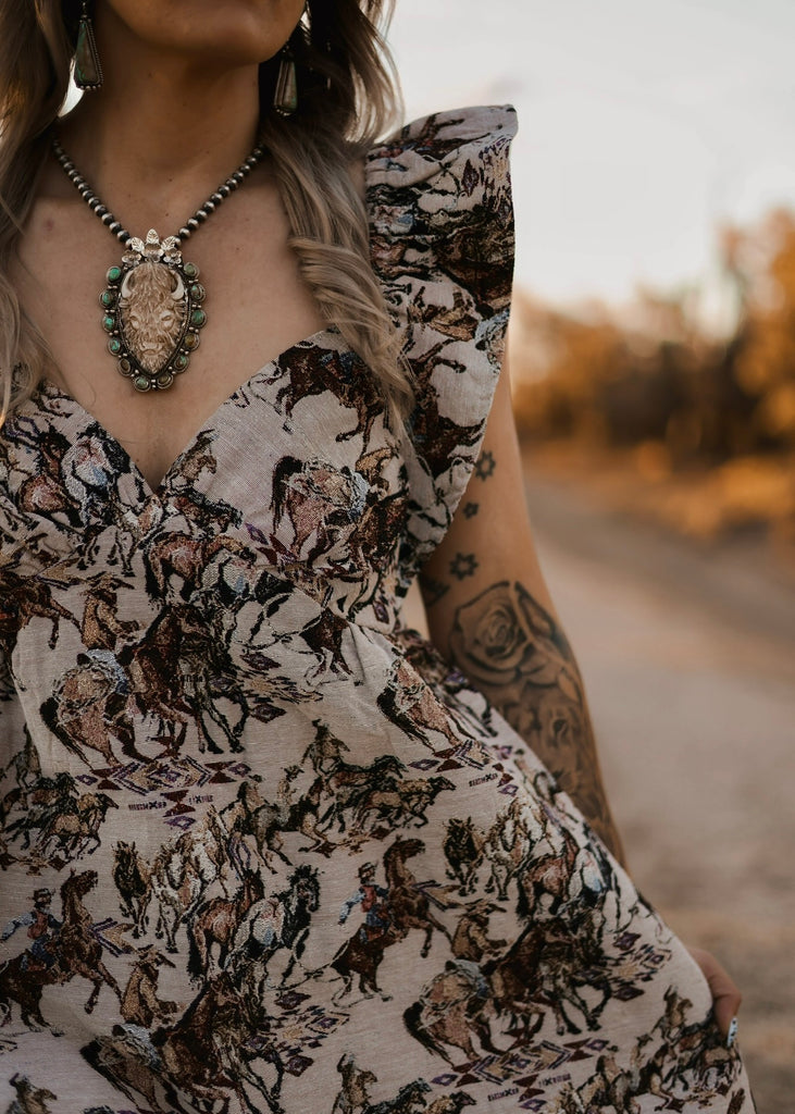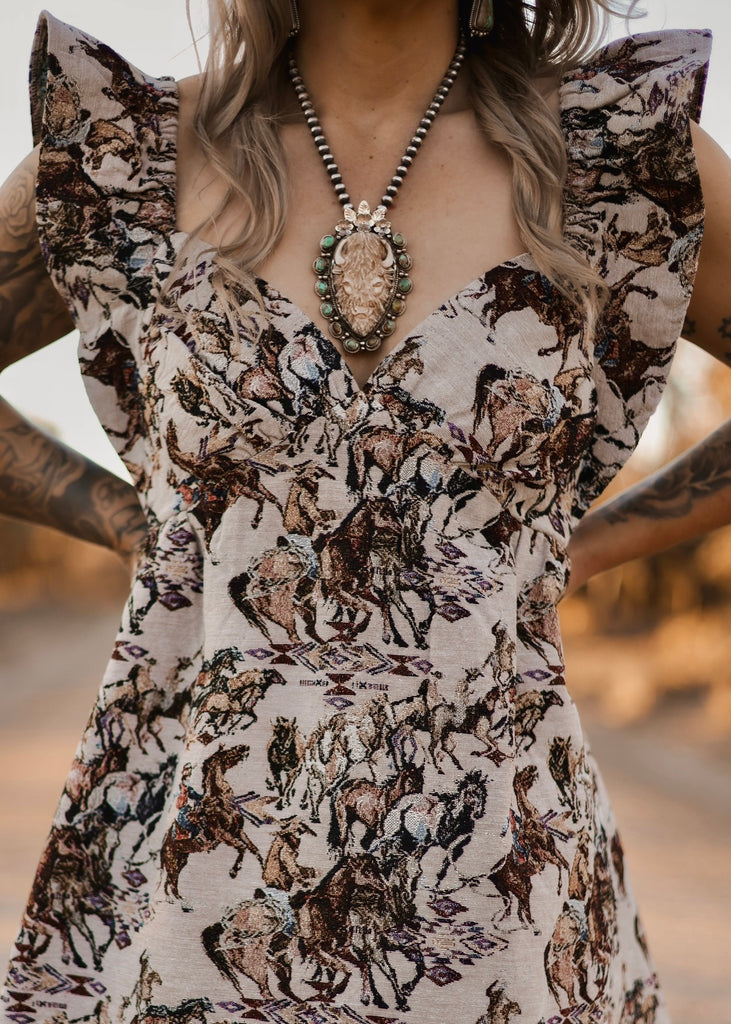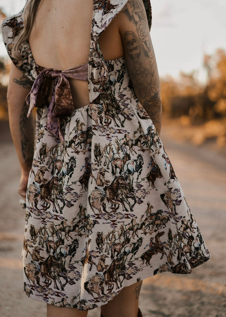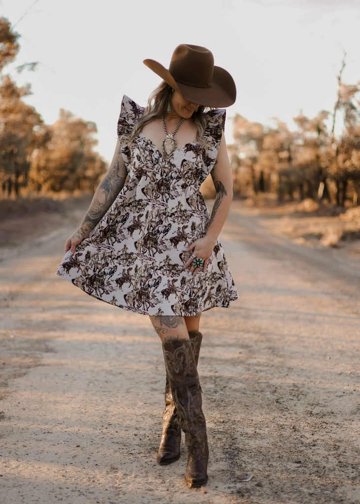Gorgeous western tapestry fabric featuring an all-over cowboy print, bold ruffle sleeves and a twirl-worthy skirt that brings structured movement to every step finished with a velvet tie at the back.