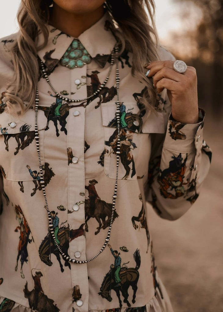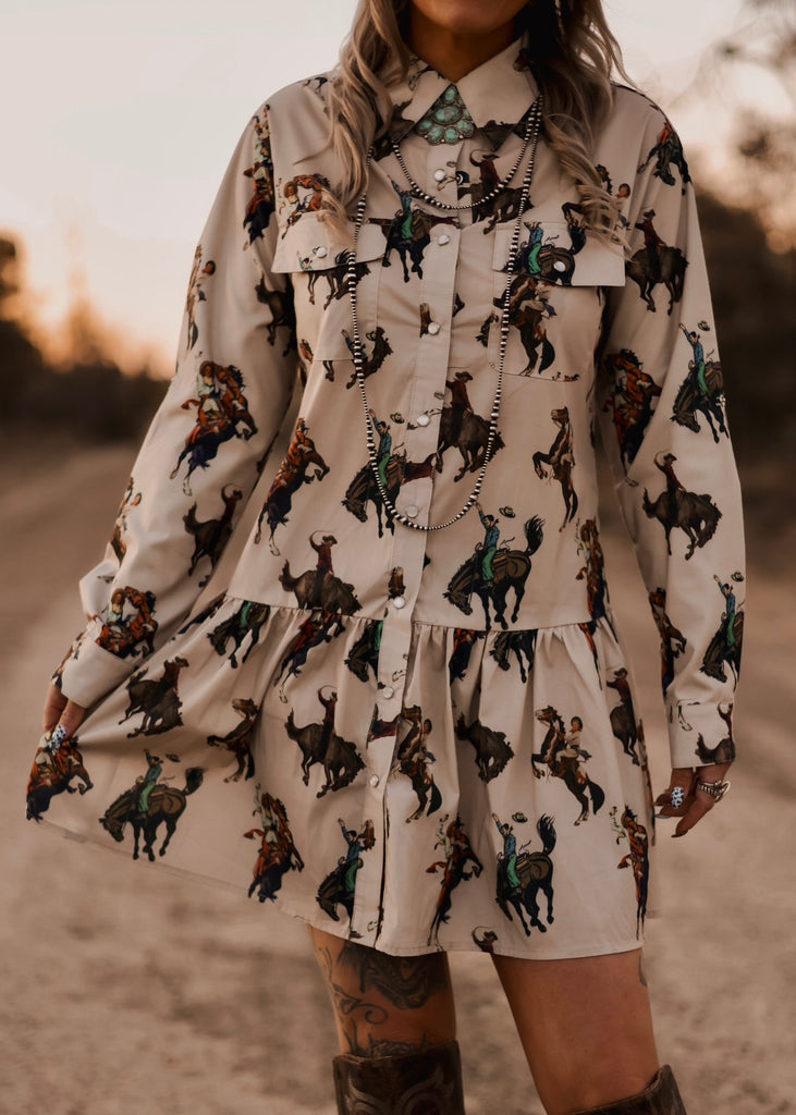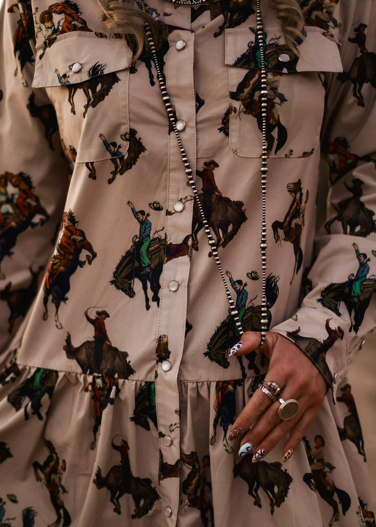 This shirt-dress features pearl snap buttons, double chest pockets, a tiered skirt, and contrast fabric inside the sleeves and cuffs. Adorned with vintage cowboys and cowgirls, it celebrates the spirit of authentic western heritage.