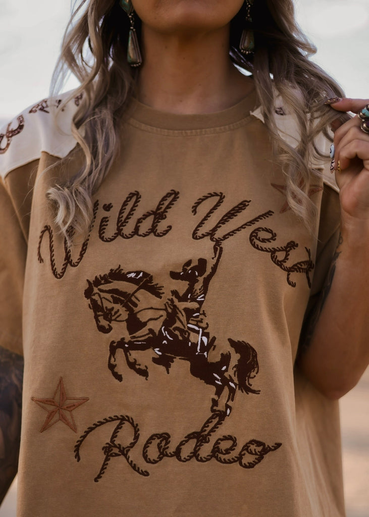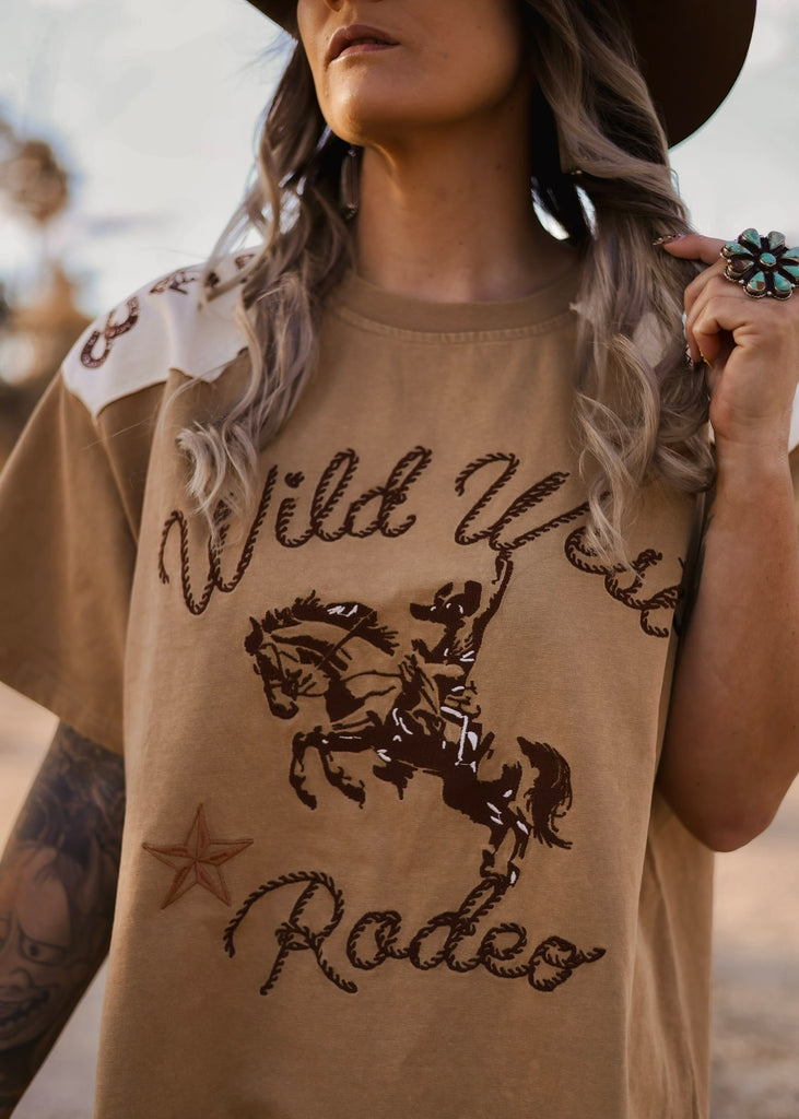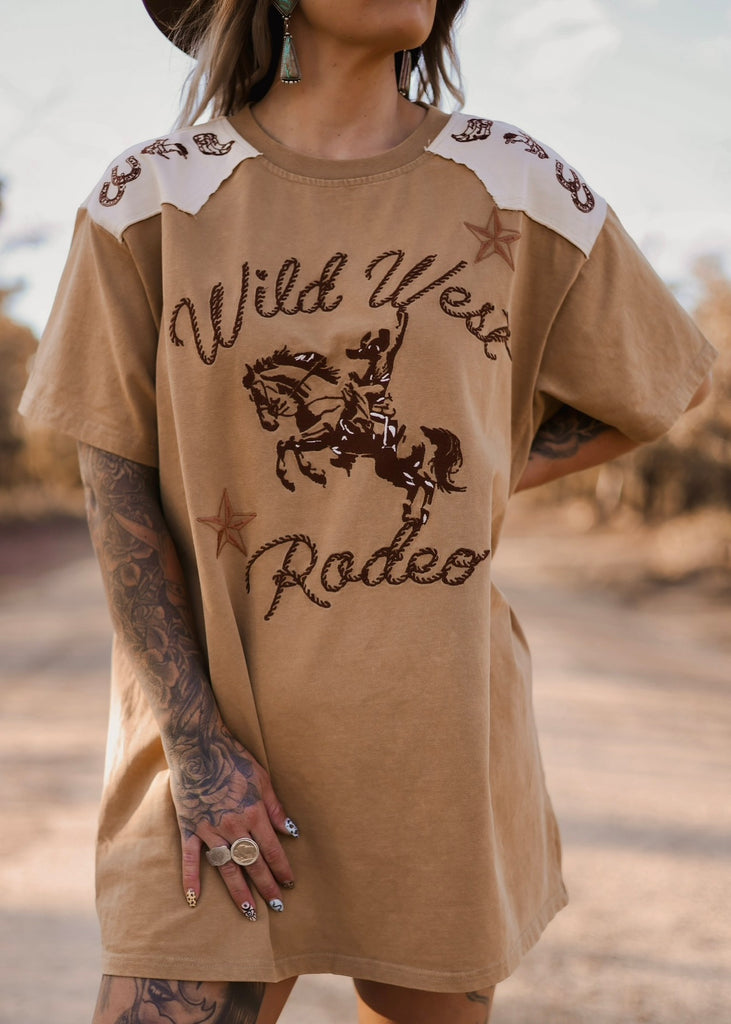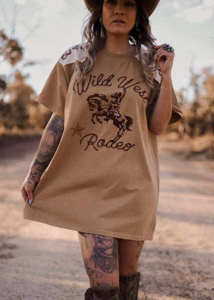 Crafted in a heavyweight tan cotton with contrast yoke panel, it’s finished with fully embroidered details of cowboys, horseshoes, stars, cowboy boots & western rope font. With its relaxed, oversized fit, this dress is perfect for throwing on with your favorite sneakers or slides for a casual day look or dressing up with boots & turquoise jewels for a night at the rodeo. This is Cowgirl comfort at its finest!