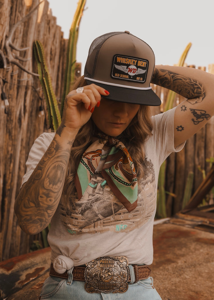 The Top Gun Trucker Cap delivers classic Whiskey Bent style with a bold, throwback edge. Featuring a warm neutral front, contrasting mesh back and statement embroidered patch, this cap blends old-school attitude with easy wearability. Designed for everyday rotation, it’s an easy go-to you’ll keep reaching for.