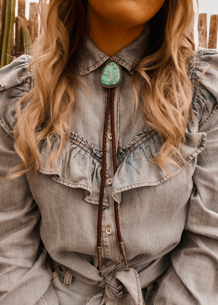 Style it worn loose for an effortless feel or cinched higher at the collar for a more classic Western look.