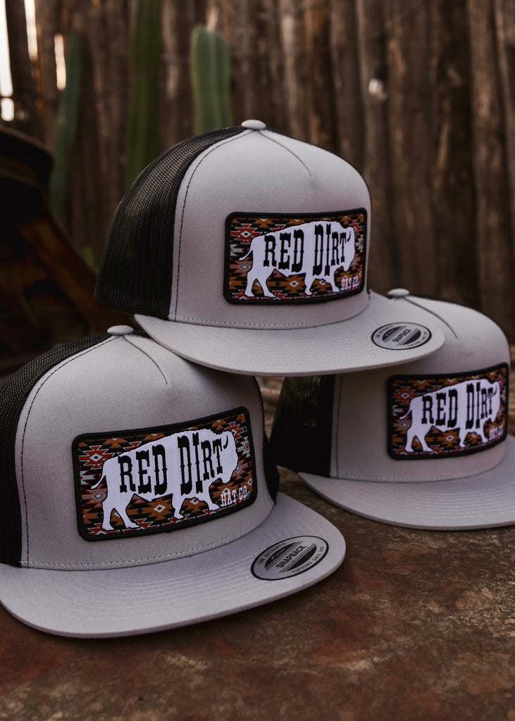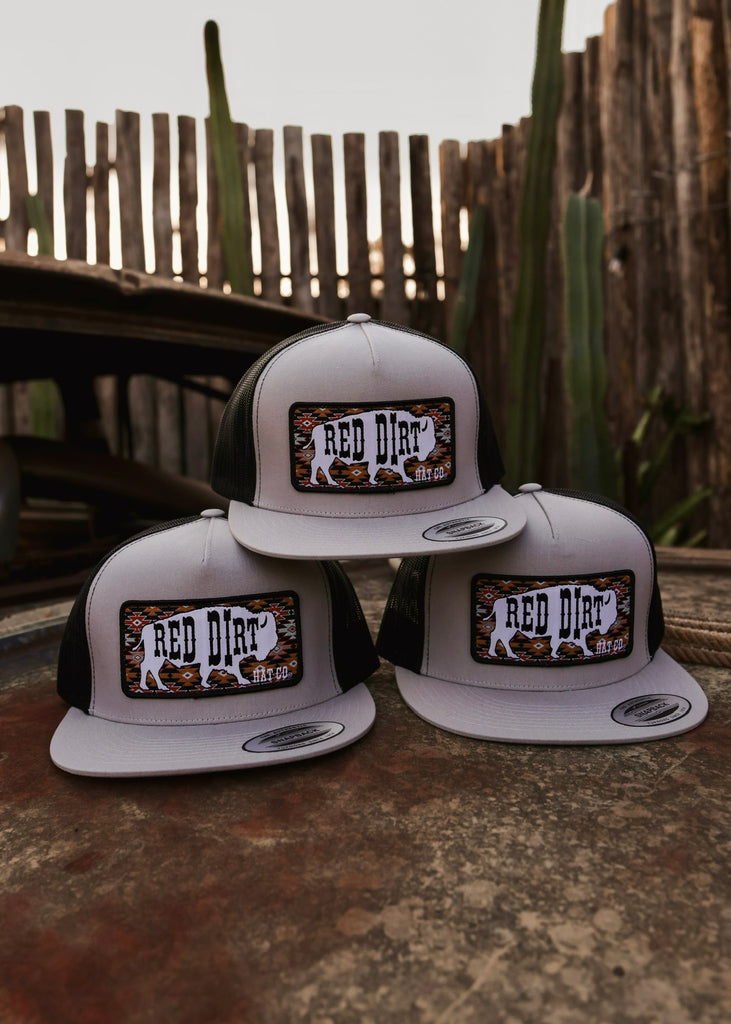 Silver and black Classic 5 panel style snapback cap featuring the “Great White Buffalo” patch.