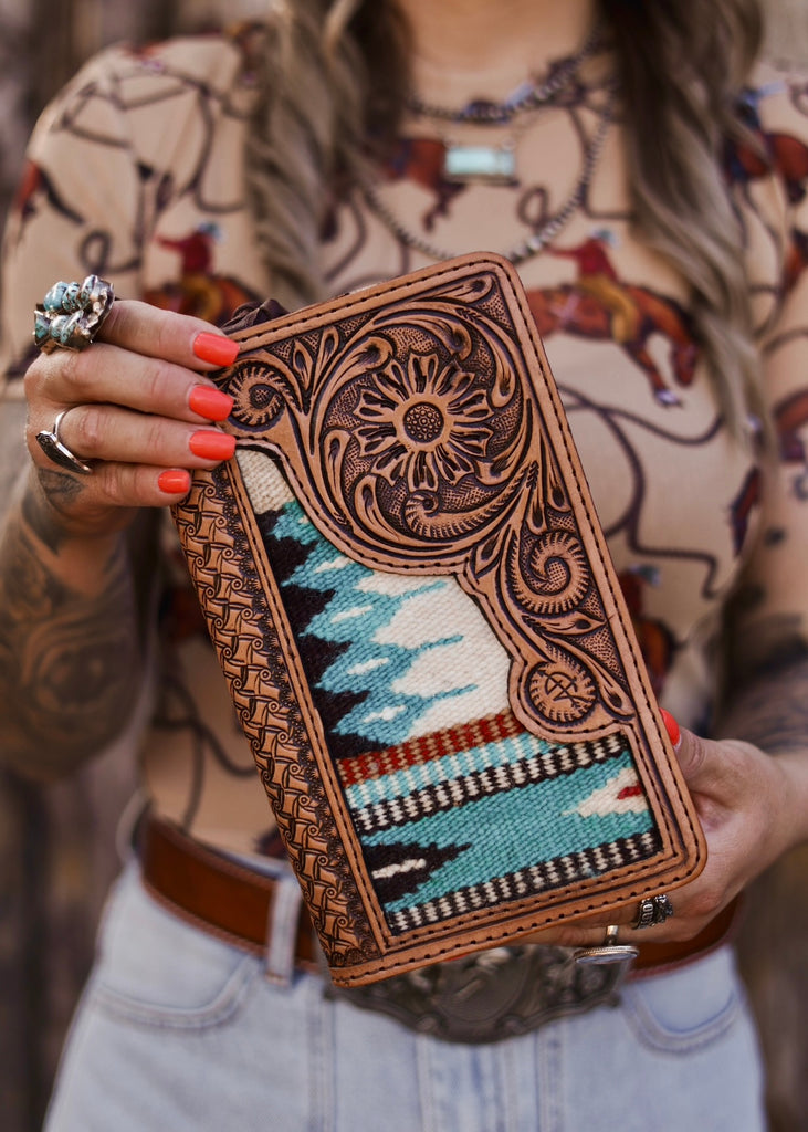 A true blend of artistry and Western tradition. This Alvaro Organiser Wallet showcases a bold woven saddle blanket inlay framed by intricate tooled leather, creating a standout piece built for everyday versatility. Carry it as a wallet, clutch, or crossbody - it’s designed to keep up with any cowgirl.