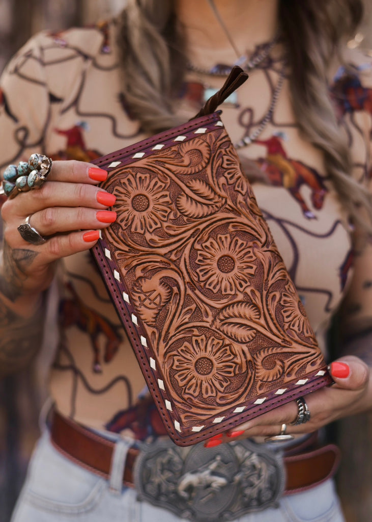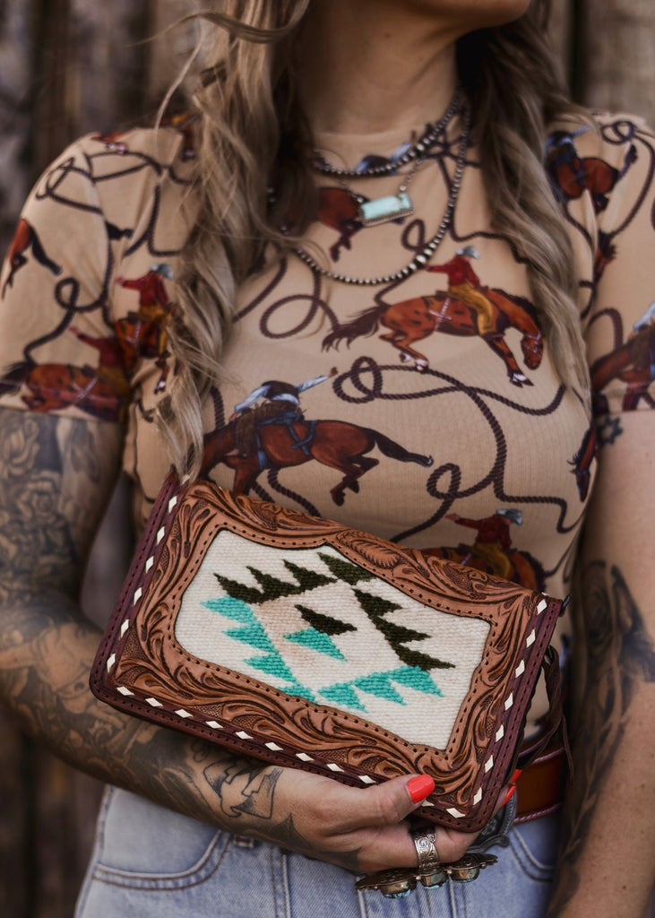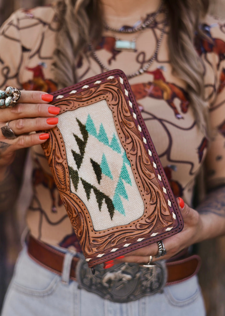 Soft, earthy tones meet classic Western craftsmanship. The Alvaro Organiser Wallet features a woven saddle blanket inlay framed by tooled leather, creating a versatile piece that’s equal parts practical and Western-chic. Wear it as a wallet, clutch, or crossbody - it’s ready for everyday adventures.