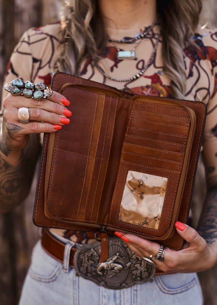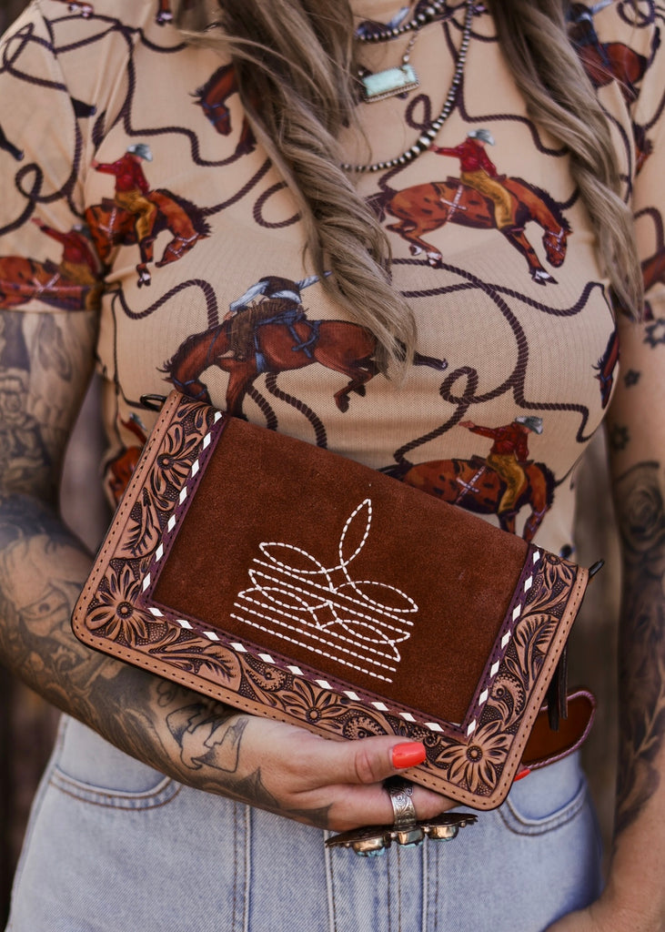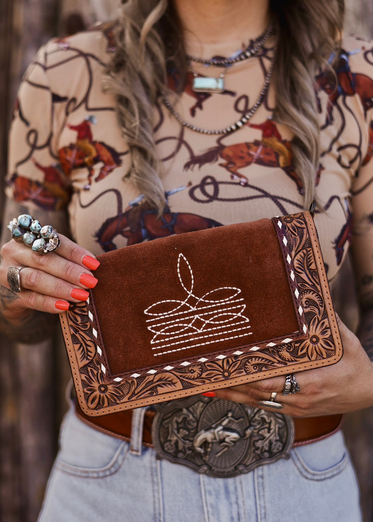 Where Western tradition meets everyday practicality. The Boot Stitch Organiser Wallet features rich suede, classic boot-stitch embroidery, and hand-tooled leather edging for a look that’s bold, timeless, and unmistakably cowboy.