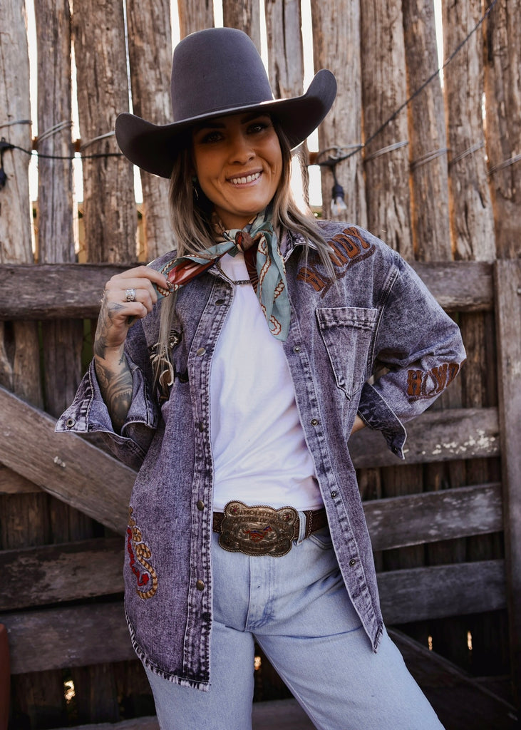 Featuring full Western embroidery throughout, from bucking broncs to rope and rodeo-inspired details, every stitch adds depth, texture and unmistakable cowboy charm. Designed with a relaxed, easy fit, it’s made for layering over tees, tanks or knits and wearing open or buttoned through.