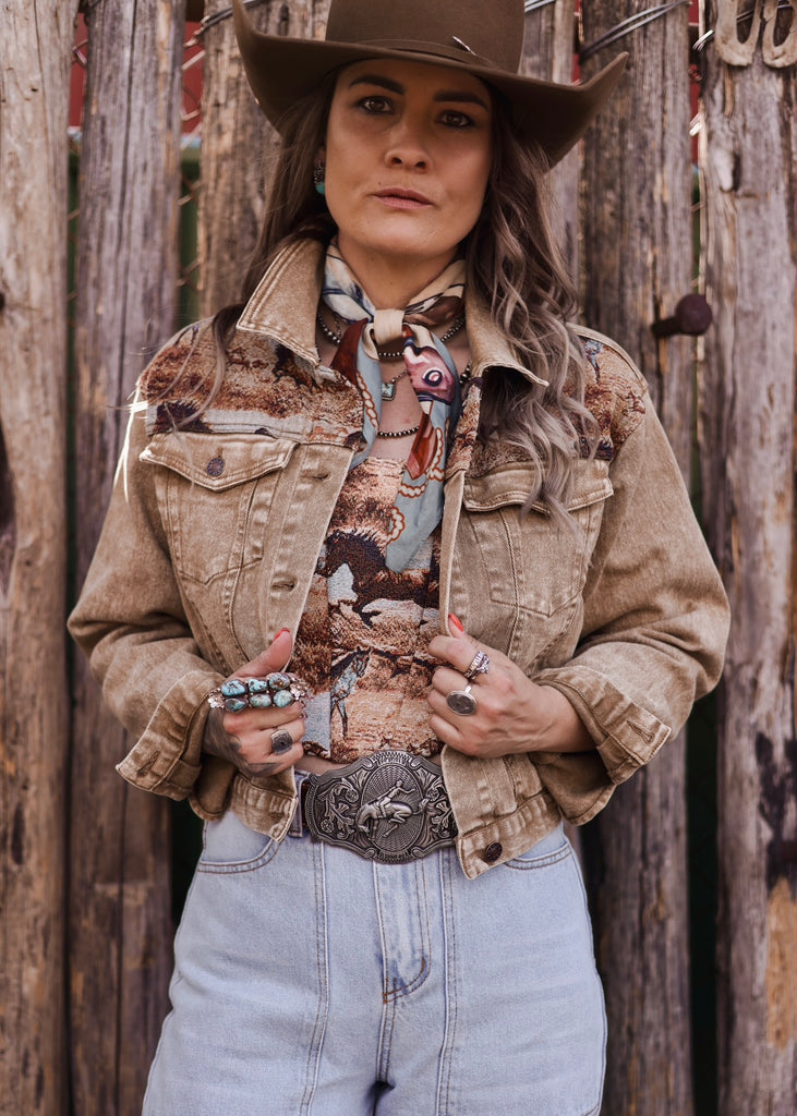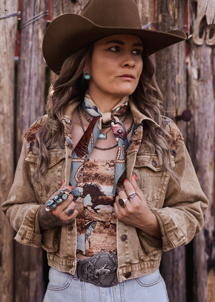 A little vintage rodeo, a little high-desert magic. The Cimarron Mustang Jacket brings vintage-washed stretch denim, wild mustang tapestry inlays and pure open range energy. From the shoulders to the full back panel, the woven artwork captures wild mustangs mid-run, honouring the untamed spirit of the Cimarron Territory of the Old West.