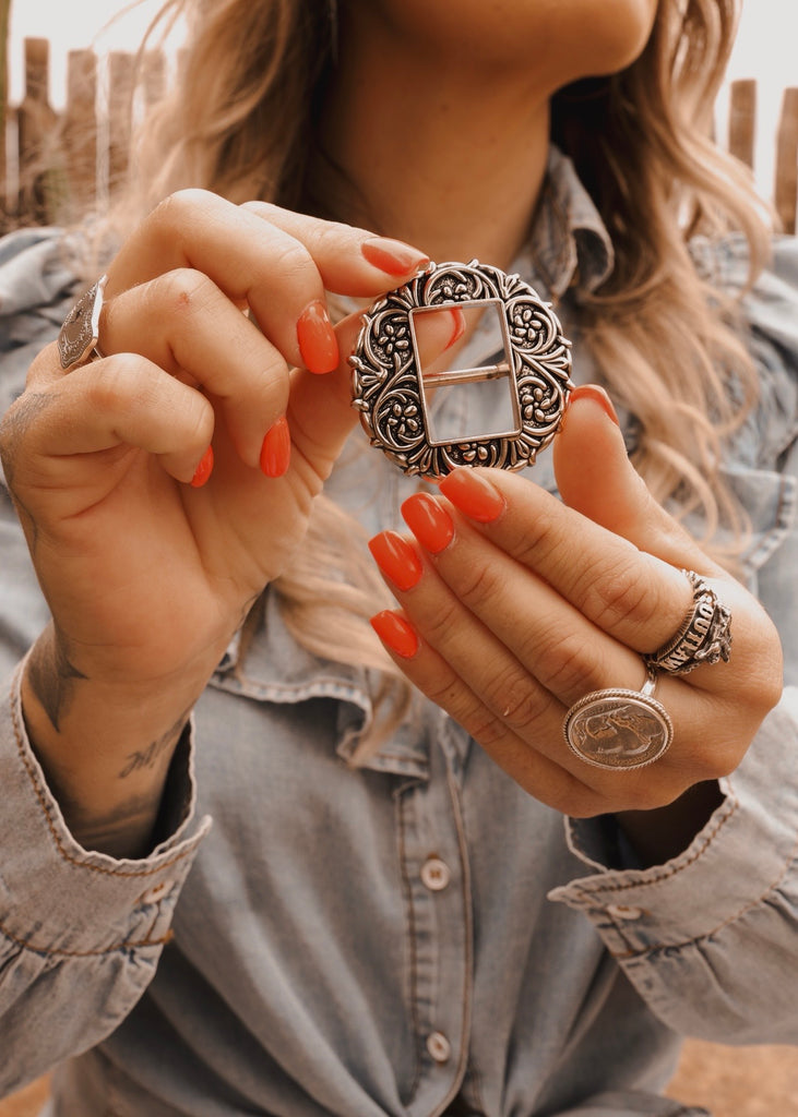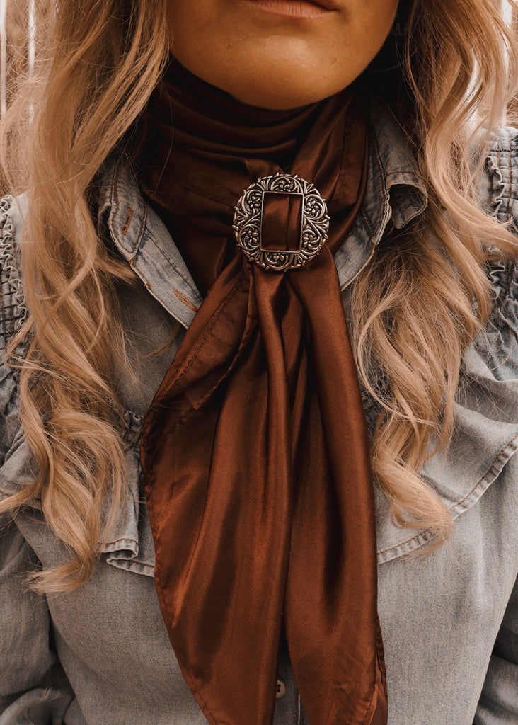 The Georgia Scarf Slide draws inspiration from traditional Western hardware, reimagined to elevate your wild rag or silk scarf with effortless authenticity. Designed to secure your scarf in place while adding a refined statement.