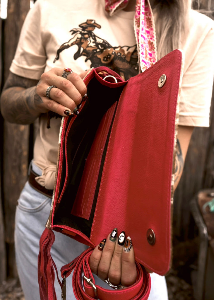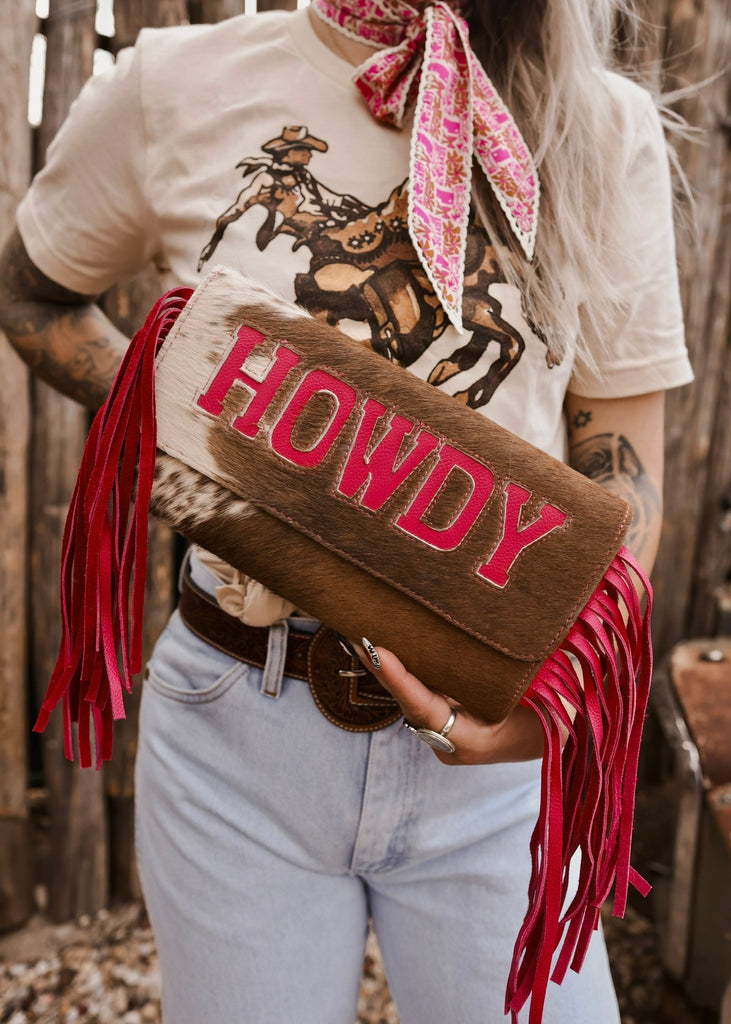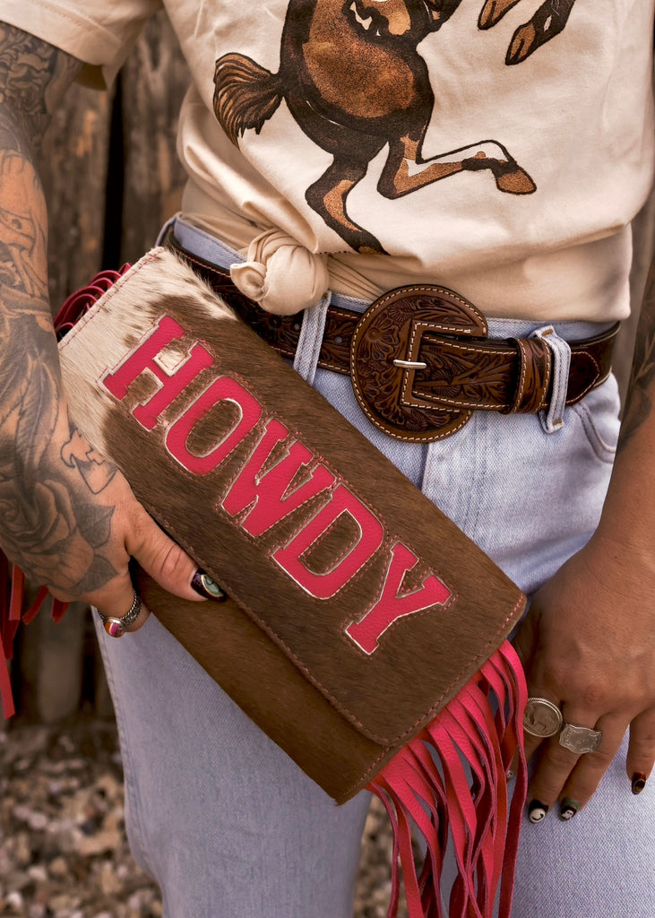 Saddle up in style with this one of a kind clutch. Crafted from genuine cowhide, this clutch brings a modern twist on a western classic with its hot pink leather “HOWDY” lettering and fringe trim. A statement piece that’s equal parts cowgirl grit and desert glam. Perfect for rodeos, nights out, or adding a pop of western flair to any look.