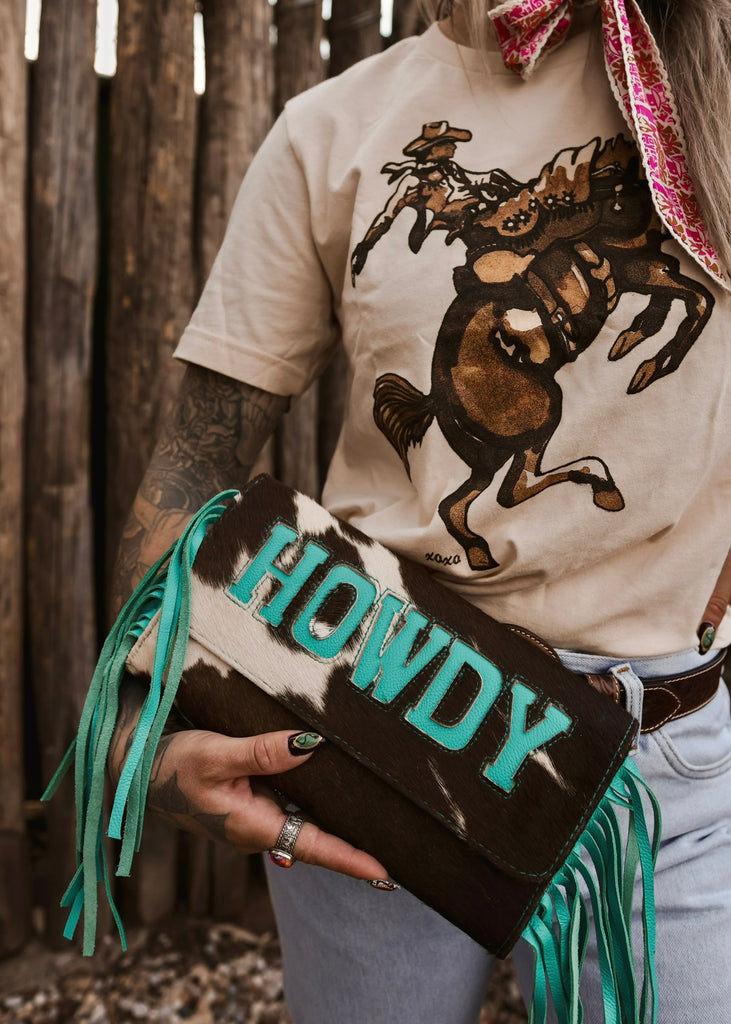 Saddle up in style with this one of a kind clutch. Crafted from genuine cowhide, this clutch brings a modern twist on a western classic with its turquoise leather “HOWDY” lettering and fringe trim. A statement piece that’s equal parts cowgirl grit and desert glam. Perfect for rodeos, nights out, or adding a pop of western flair to any look.