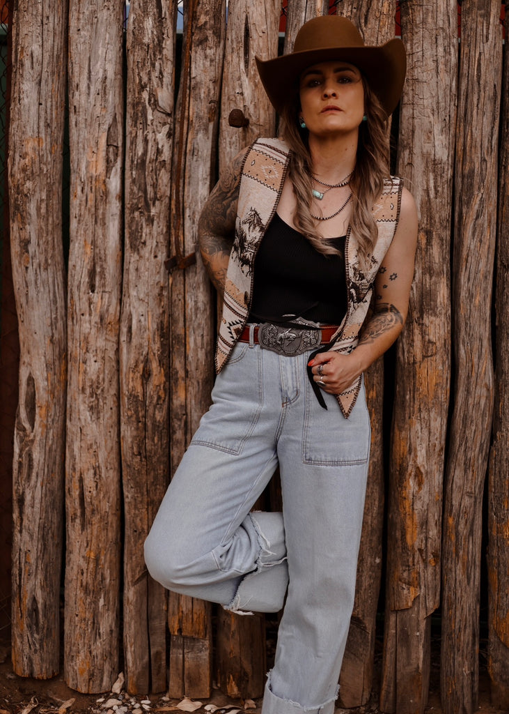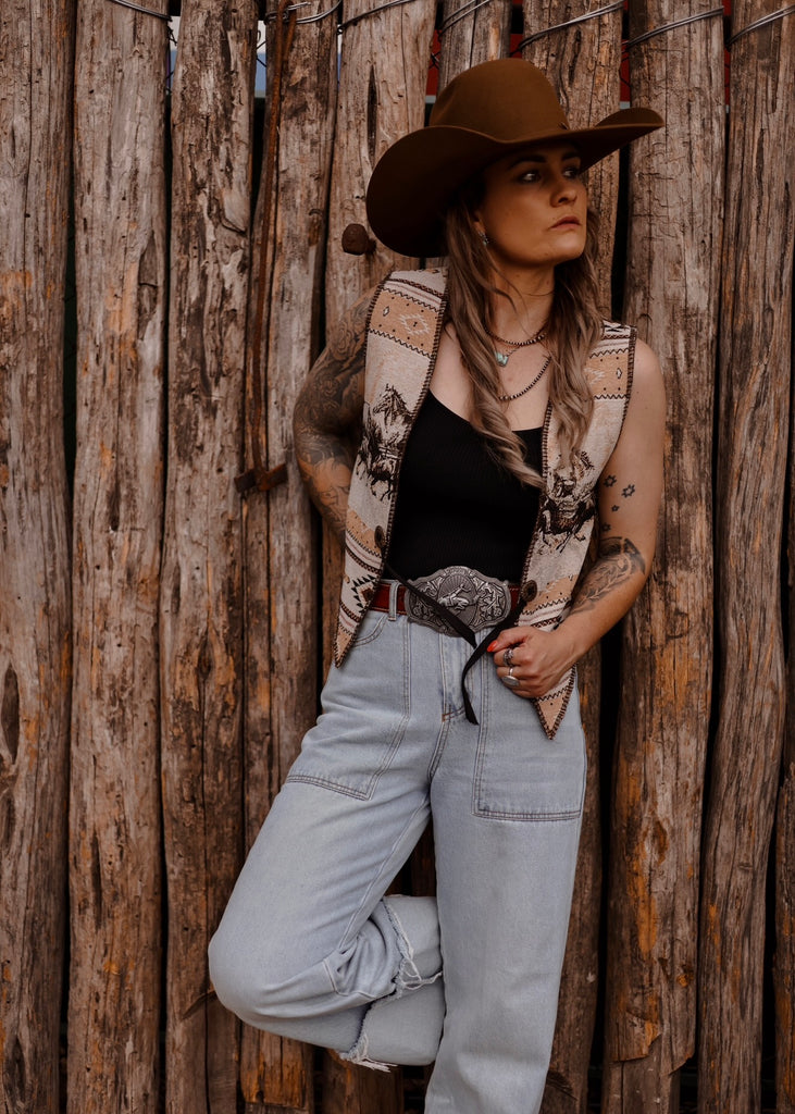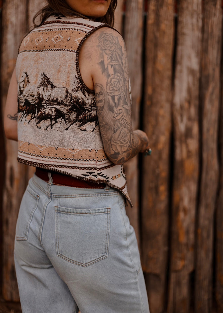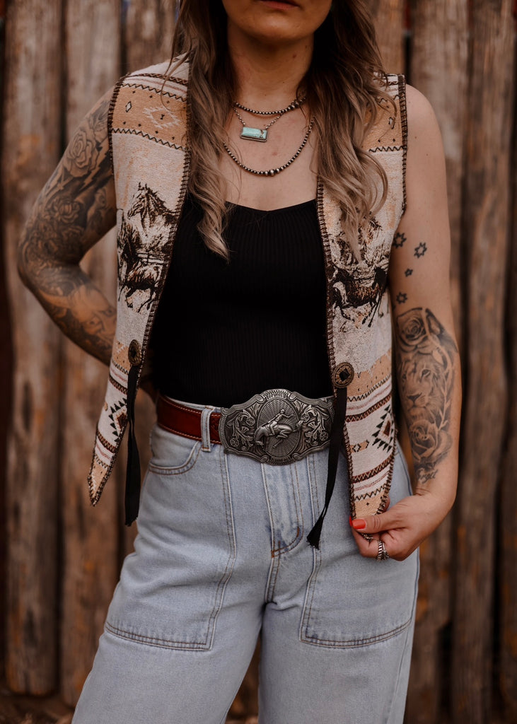 Kick up a little desert dust with the Sagebrush Stampede Vest. Woven in warm, earthy tones, this western tapestry vest features detailed running horses and bold Aztec patterns, finished with classic conchos that capture that wide open range energy.