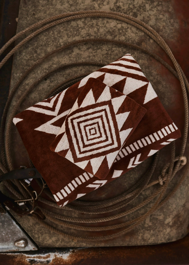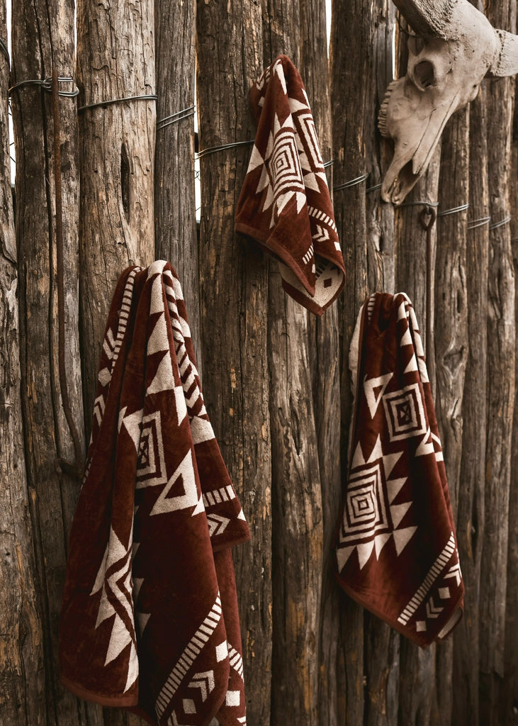 Capture the magic of Arizona’s red rock country with The Sedona Sunset Towel Set. With bold white Aztec designs set against a rich rust-red backdrop, this set reflects the fiery glow of Sedona’s cliffs at sundown.