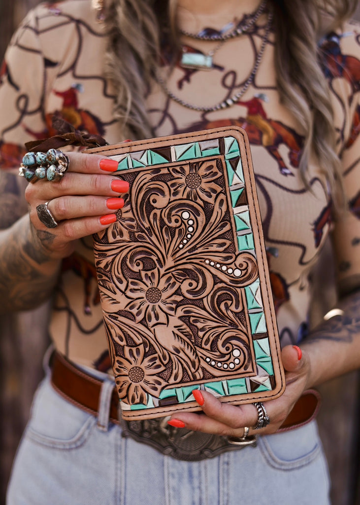 Crafted for the modern cowgirl, the Turquoise Trails Organiser Wallet pairs everyday function with timeless Western flair. Its versatile, roomy design lets you wear it your way – as a wallet, clutch, or hands-free crossbody.