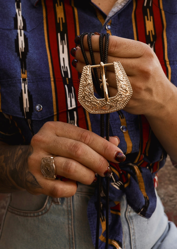 The Western Buckle Bolo draws inspiration from classic rodeo hardware and vintage belt buckle detailing, reworked into a statement bolo with unmistakable Western presence.