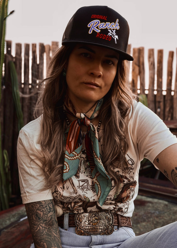 Built for long days, late nights, and every dusty mile in between, this classic black trucker cap brings that punchy ranch-raised rodeo spirit front and centre. Featuring bold embroidered lettering and a bucking bronc graphic, it’s the perfect mix of old-school Western grit and everyday wearability.
