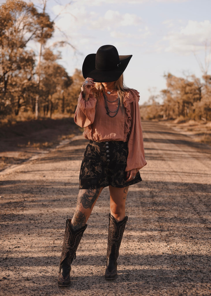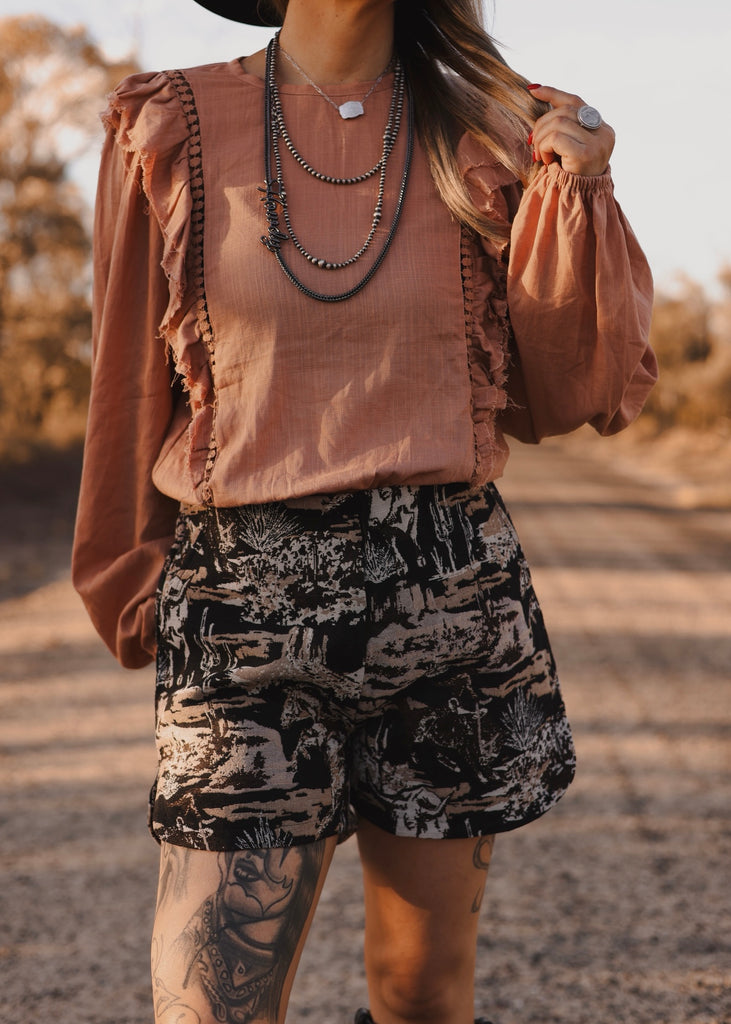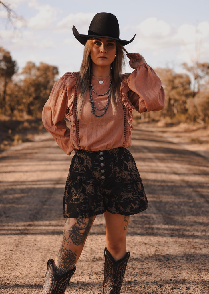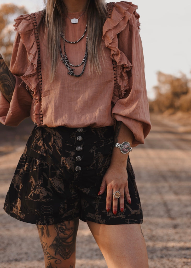The Desert Rose Ruffle Blouse is crafted in a warm, muted rose tone that brings understated femininity to any outfit. Featuring delicate ruffle detailing through the shoulders and neckline, this blouse balances softness with strength - a subtle nod to classic Western styling.