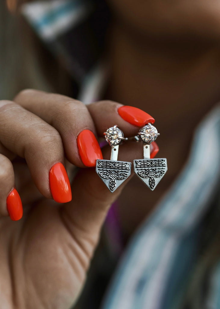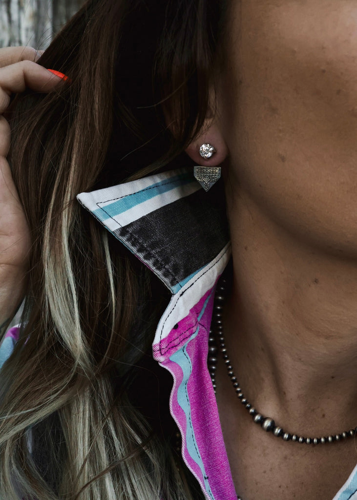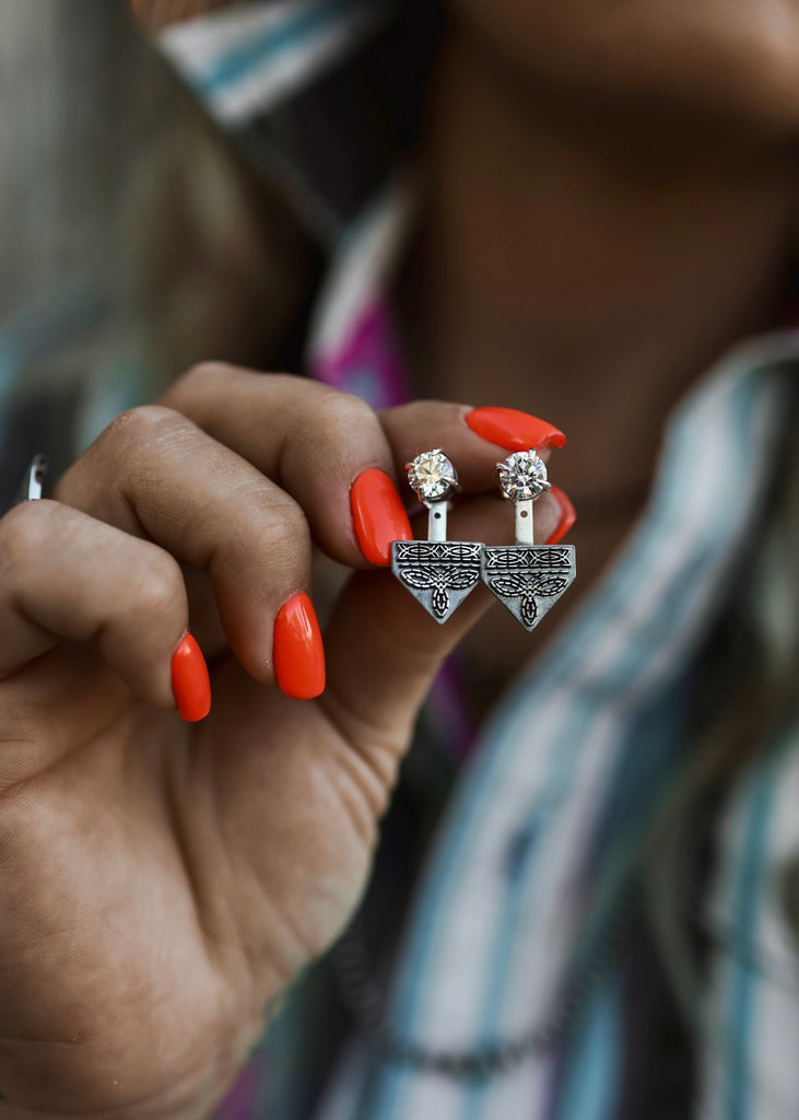 A unique and versatile ear jacket featuring a detailed boot stitch motif and sparkling 8mm white crystal stud. The thoughtfully designed boot stitch ear jacket includes three adjustable holes to ensure the perfect fit. With a total drop of 25mm and a 6mm ear back, this piece is created for both comfort and statement styling. Antiqued with a brushed finish, it brings a modern edge to a western-inspired aesthetic.