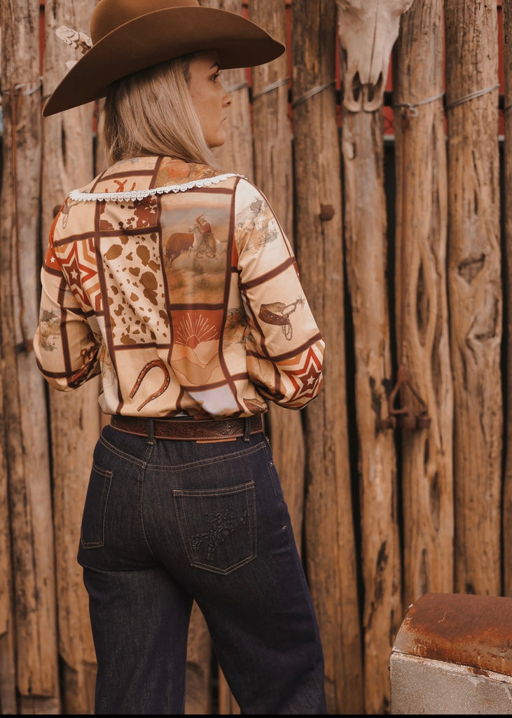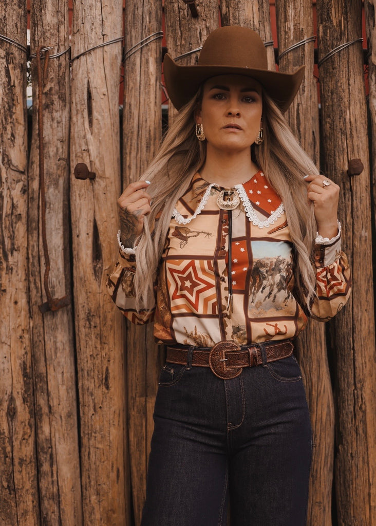 Featuring a full button front and a delicate Peter Pan collar finished with lace trim, this blouse carries that heirloom feel with a refined western edge. Lace detailing continues at the cuffs, adding a subtle touch of romance against the bold rust and cream tones woven through the print.