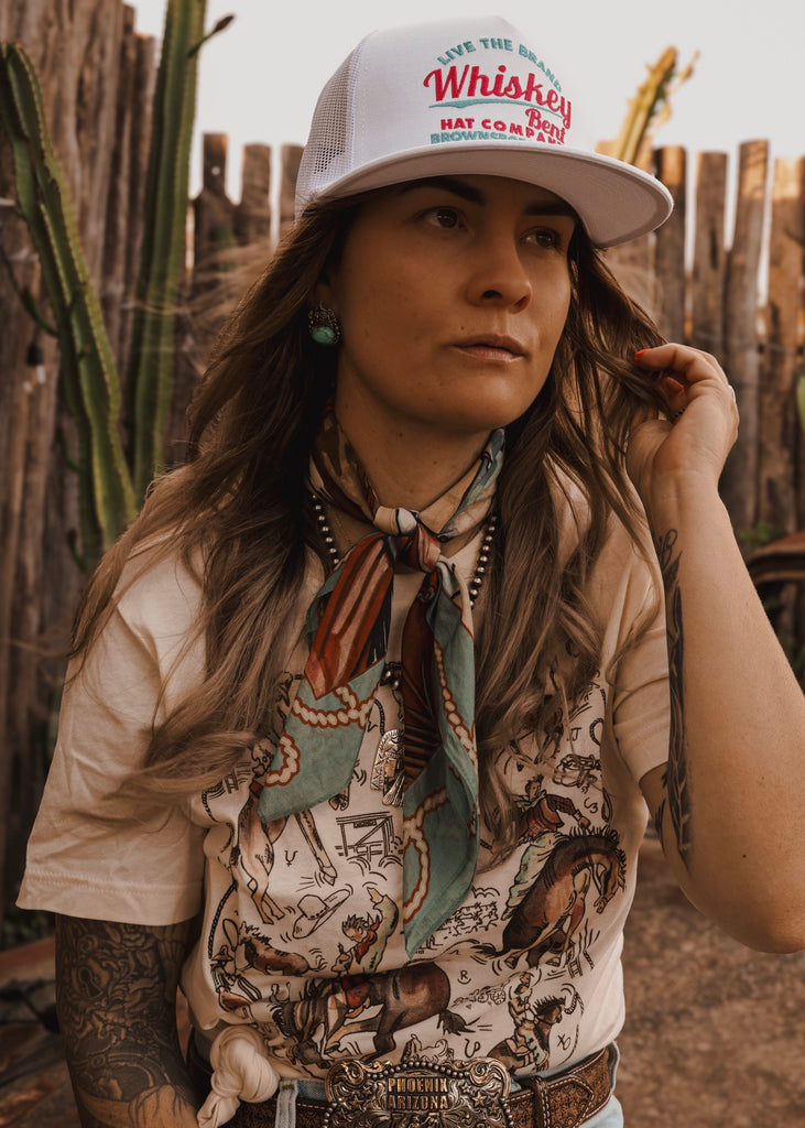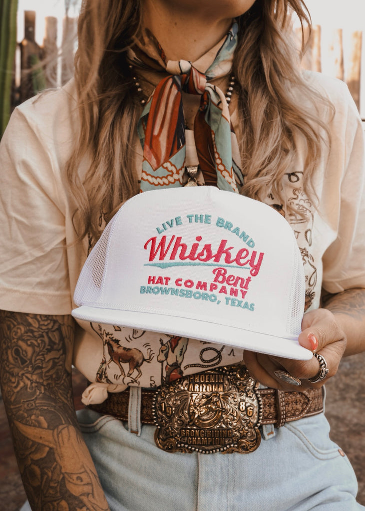 Bright, bold and built for good vibes, The Cali Trucker Cap brings a fresh twist to Whiskey Bent’s classic look. Featuring vibrant teal and pink embroidery that pops against a clean white base, this cap carries that easygoing, live-the-brand attitude from Brownsboro, Texas.
