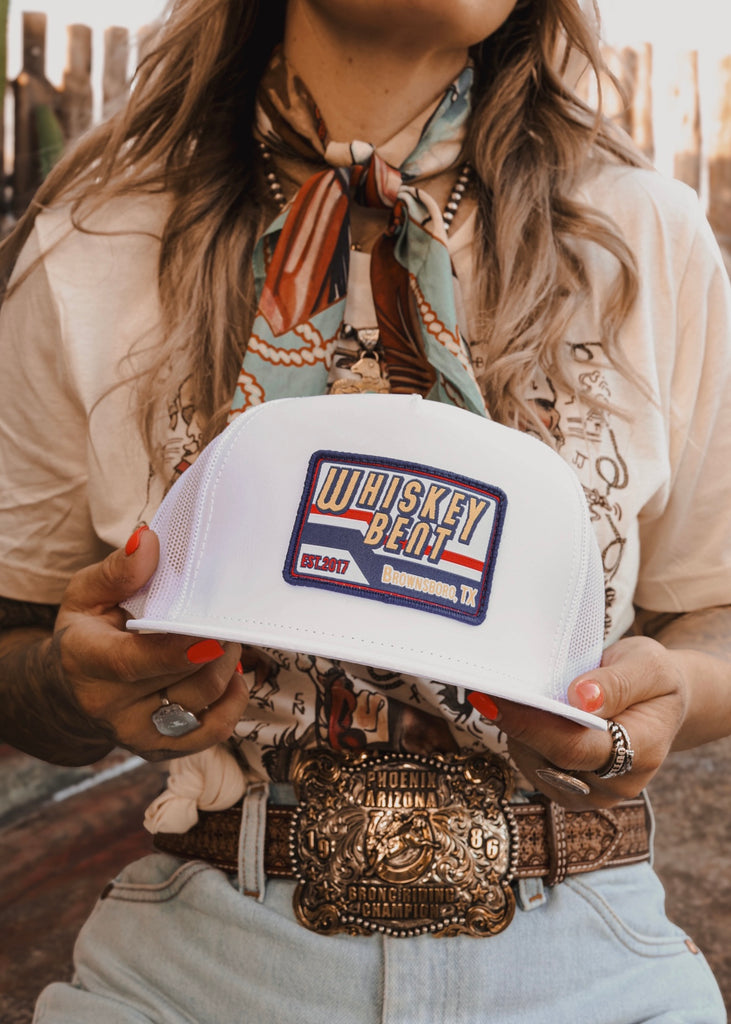 Make a bold statement with the Talladega Trucker Cap. Built with a clean white base and a punchy red, white and blue patch, this cap channels that fast-paced, all-American energy while keeping true to Whiskey Bent’s Brownsboro, Texas roots.